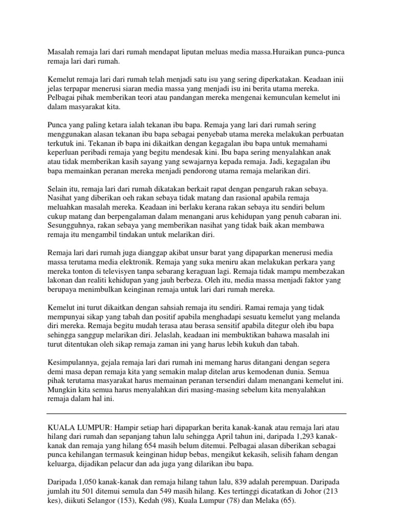 Penutup Karangan Remaja Lari Dari Rumah Pendek kata semua hujah yang dihuraikan tadi membawa budaya lari rumah ini sebagai satu perkara yang lazim berlaku dalam kalangan remaja kita. Karangan Pengajian Am PA STPM. Semua pihak terutama masyarakat harus memainan peranan tersendiri dalam menangani kemelut ini.